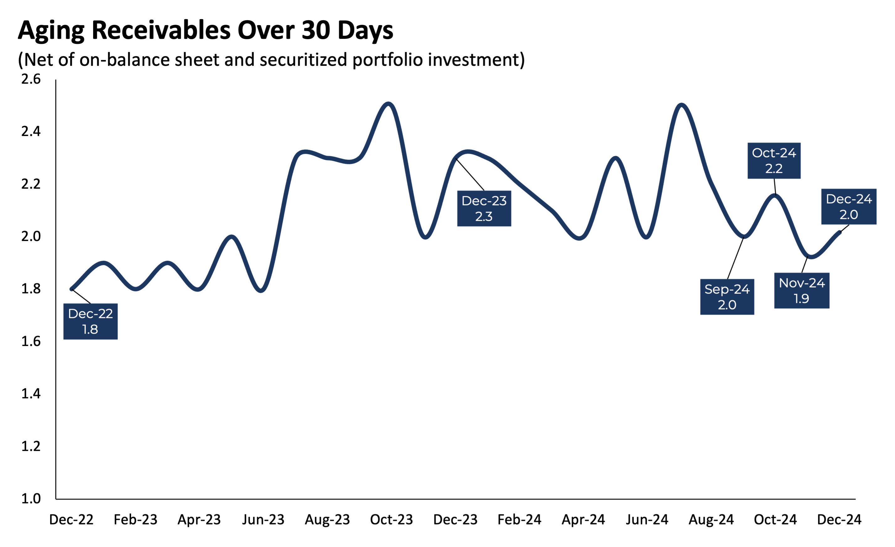 Financial conditions remain healthy. Charge-offs dropped to 0.52% as a percentage of net receivables, a welcome decline after the November jump of 0.26 percentage points. Aging receivables over 30 days also rose slightly to 2.0%, but continue to hover near two-year lows.