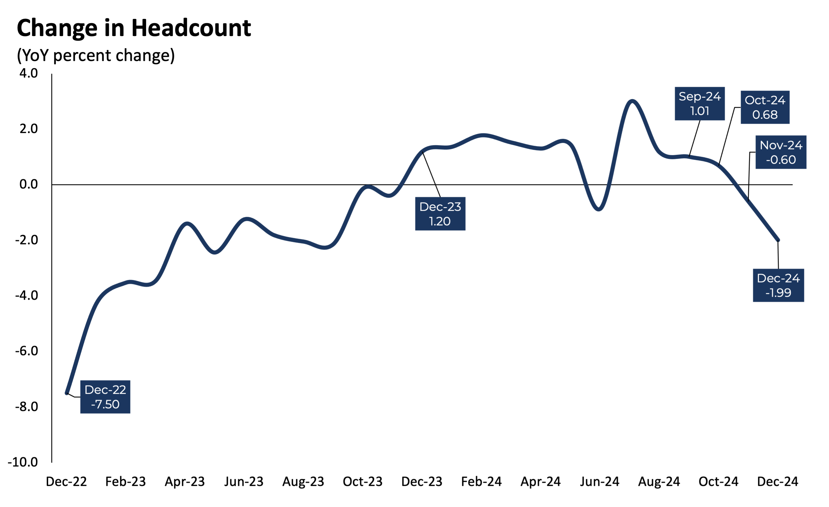 Employment contracted further. Employment in the equipment finance industry contracted again in December, with the 12-month change from December 2023 dropping by nearly 2.0%. Employment at banks and captives declined year over year by 1.2% and 7.1%, respectively. Those declines were partially offset by the 2.5% increase in headcount at independents.