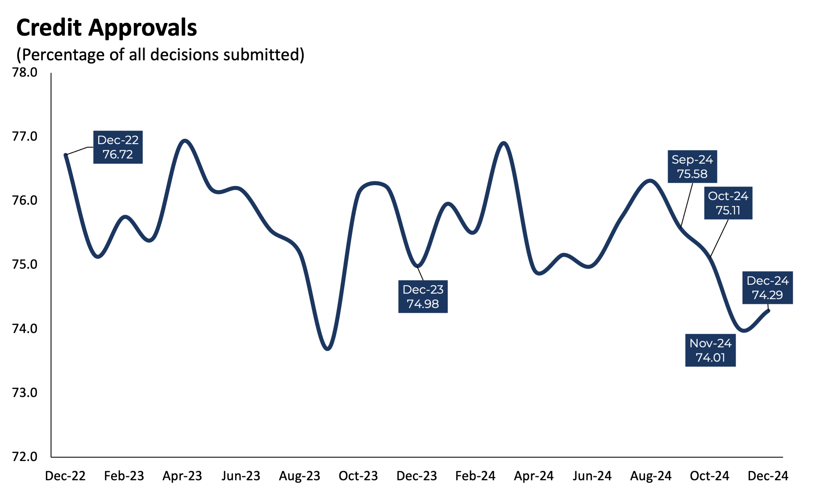 The credit approval rate ticked up but remained near its 2024 low. The average credit approval rate increased to 74.3% of all credit decisions in December, after a precipitous decline from August to November. While the overall increase was modest, approval of small ticket financing saw its biggest one-month increase since March, rising by 3.6 percentage points.