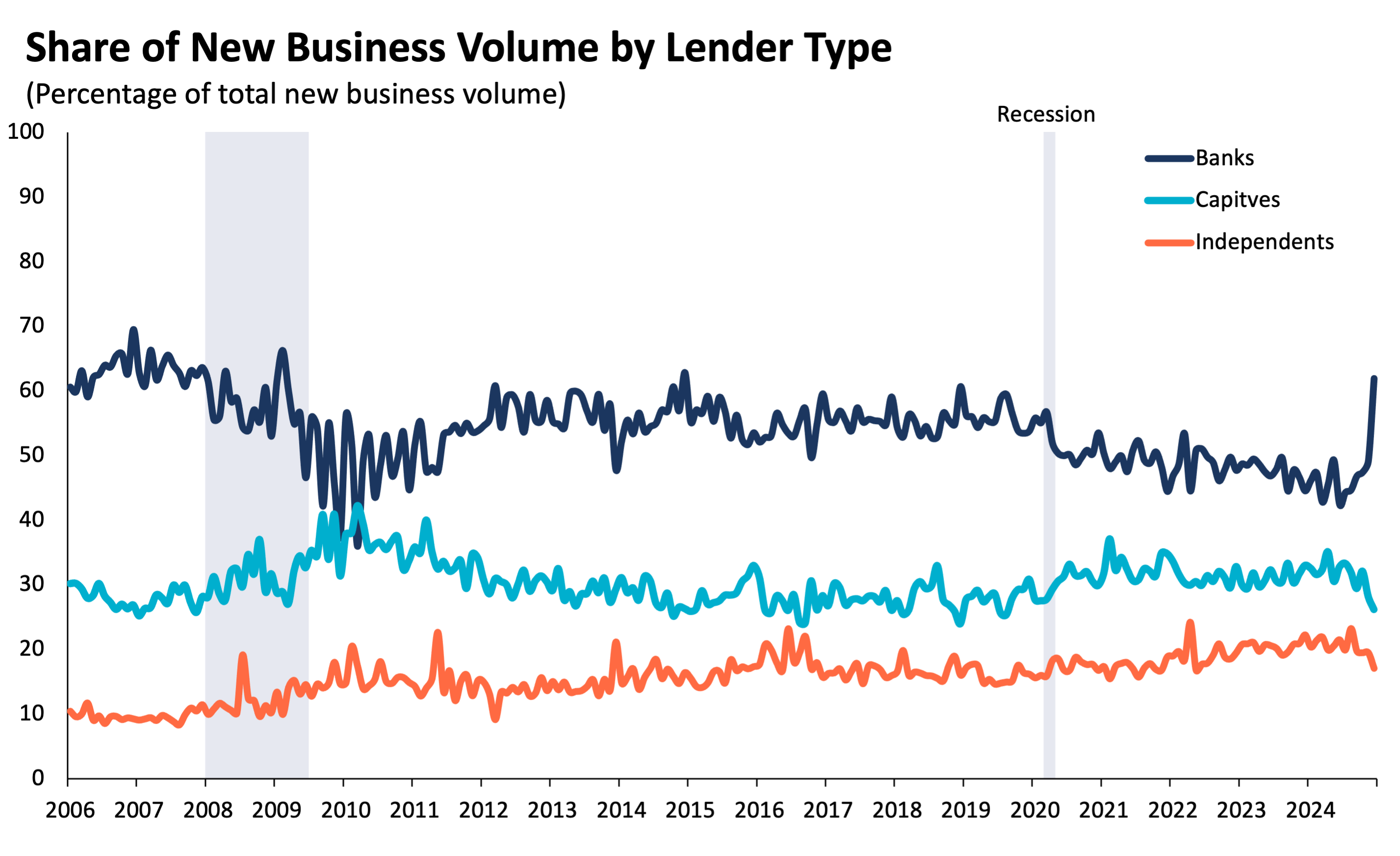 Bank financing drove the jump in new activity. Most of the 8.1% monthly rise in NBV came from the banking industry, which surged by 36.2% from November to December. That jump outweighed the modest 0.2% rise in new business growth for captives and the 5.3% contraction in financing activity at independents. The jump in bank lending is the largest on record and pushed the share of bank business activity to nearly 62% of total new business volume, its highest share since before the Global Financial Crisis in the mid-2000s.