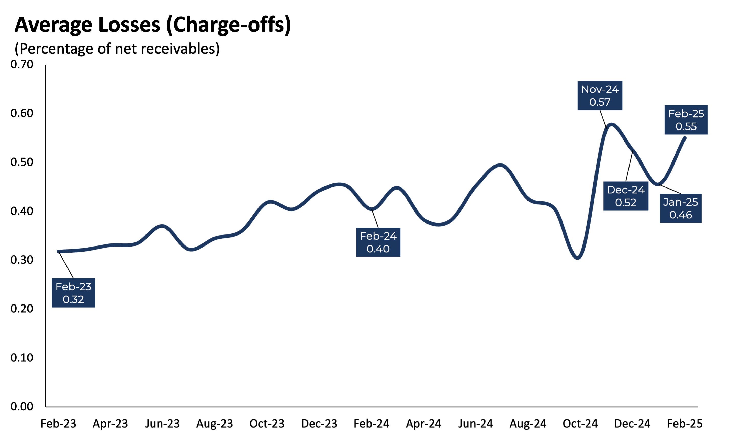 - Charge-offs (losses) rose to 0.55%, near the two-year high seen last November.