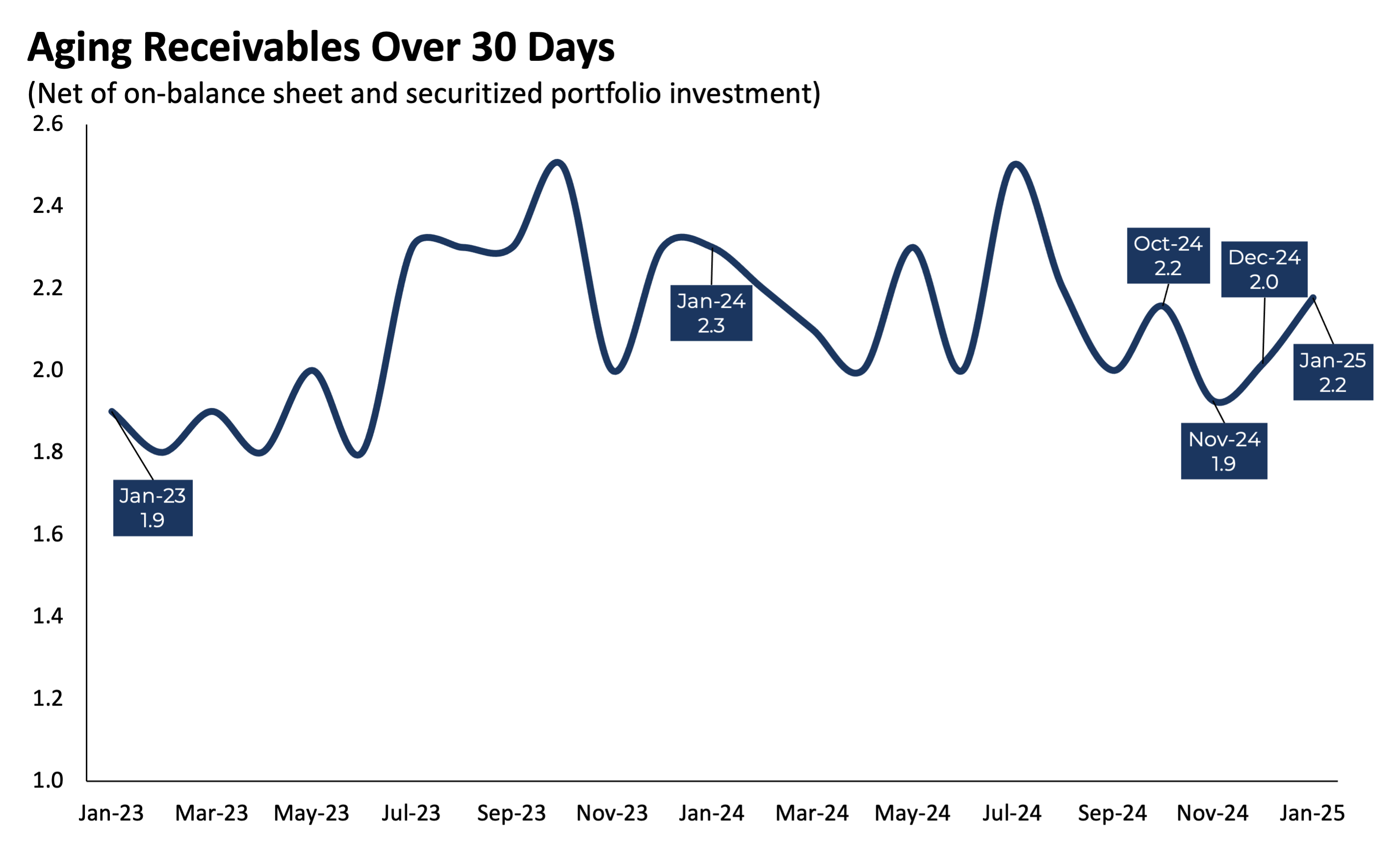 Financial conditions remain healthy. Charge-offs dropped for the second consecutive month to 0.46%. The January decline brings the rate to just above levels experienced in the ten months prior to the November increase. Aging receivables over 30 days ticked up to 2.2% but remained low.