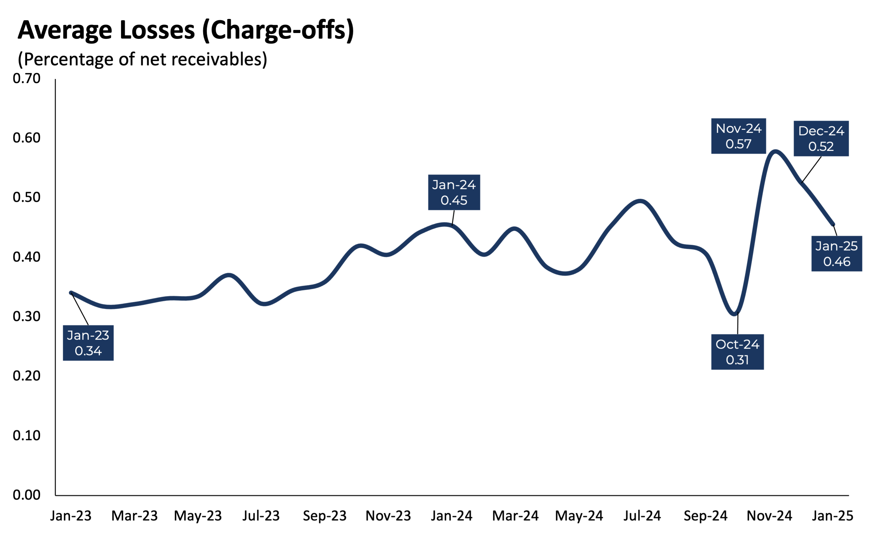 - Charge-offs (losses) dropped to 0.46%, the second decline in as many months.