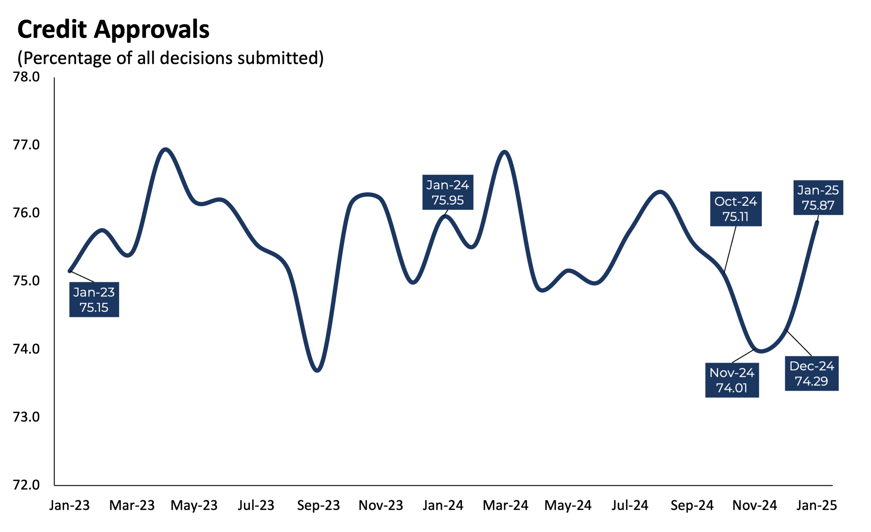 Credit approvals jump. The average credit approval rate increased to 75.9% in January, up 1.6 percentage points, the largest increase since October 2023. The rates for banks, captives, and independents all rose.