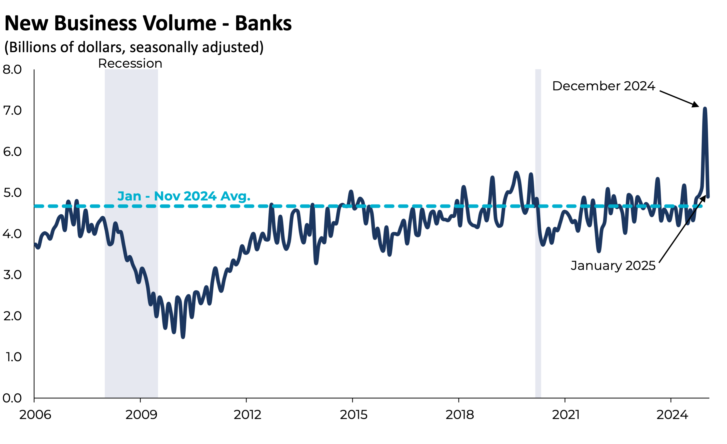New business volume growth dropped. NBV growth experienced its largest one-month drop on record, falling by 17.8% from December to January. While the percentage decline was sharp, the dollar amount of new business was only at its lowest since March 2023. New activity at banks and captives both experienced a monthly drop of more than 30%, while financing at independents grew by almost 9%. The dollar amount of new business was still above its monthly average from January through November of 2024, while new activity at captives declined to its lowest level since January 2017.