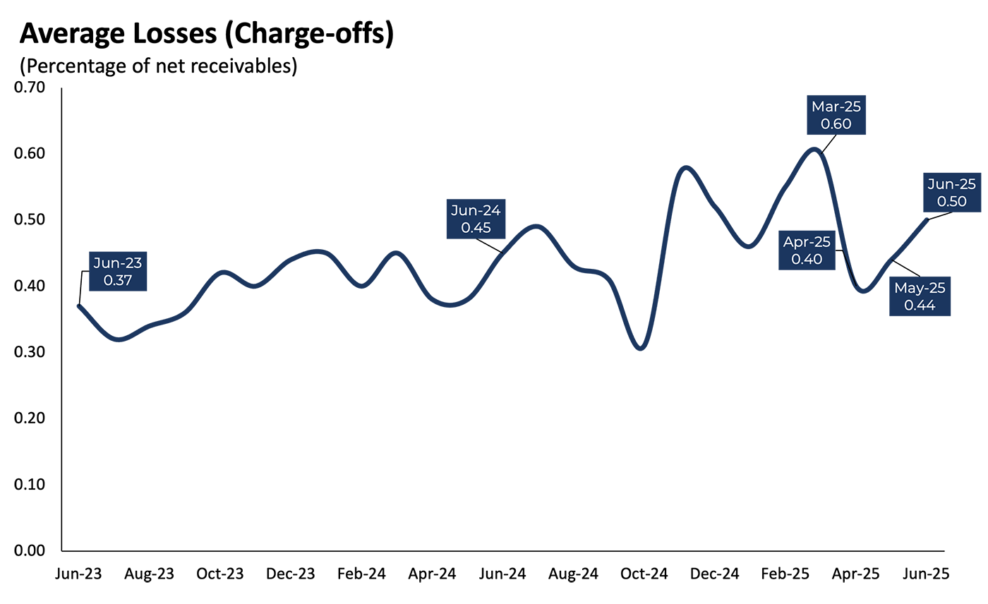 Losses rose, but delinquencies dropped. The overall delinquency rate fell to 1.9% in June, down 0.27 percentage points month over month. The rate at banks decreased by 0.49 percentage points, offsetting the 0.41 percentage point increase observed in the prior month.