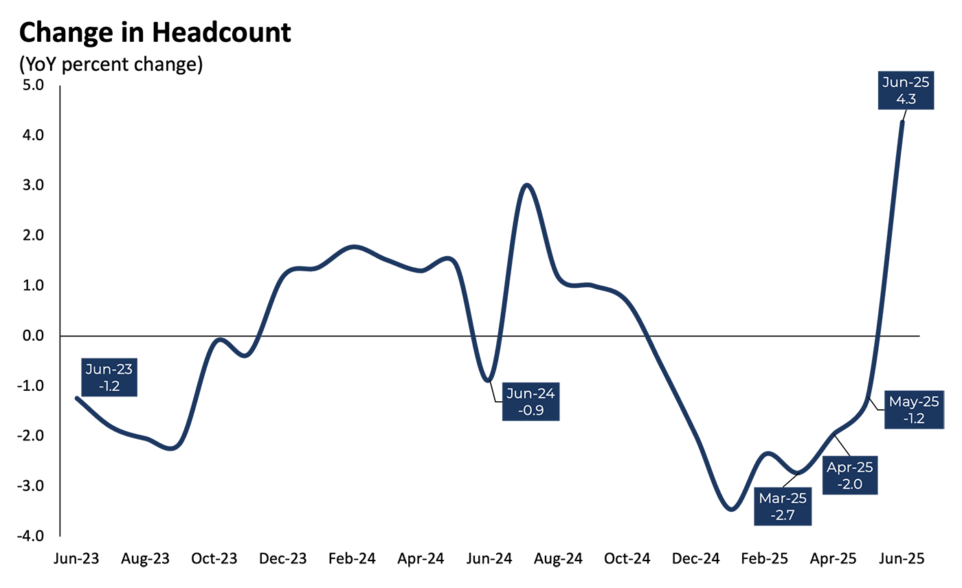 Headcounts rose for the first time this year. The 12-month change in total employment was up 4.3% from June 2024. All three institution types experienced job gains over the last 12 months.