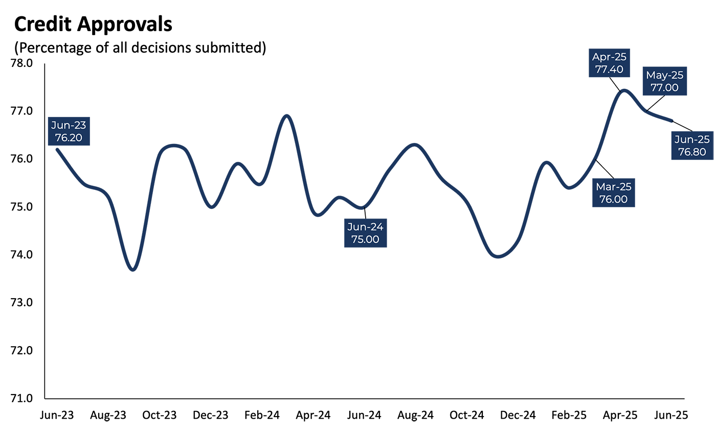 The credit approval rate dipped but remains elevated. The average credit approval rate dropped to 76.8% but remained near its recent peak of 77.4%. The rate at banks decreased by 3.3 percentage points to 75.7%. That drop outweighed the 4.1 percentage point and 3.0 percentage point increases at captives and independents, respectively. The approval rate for small ticket deals was also up slightly from May.