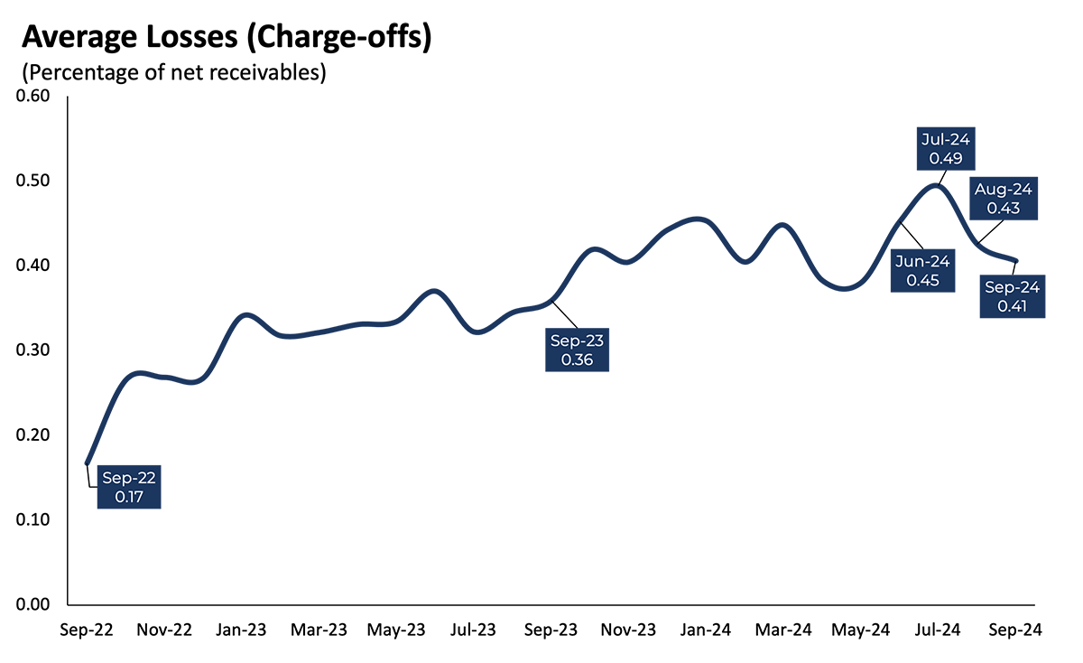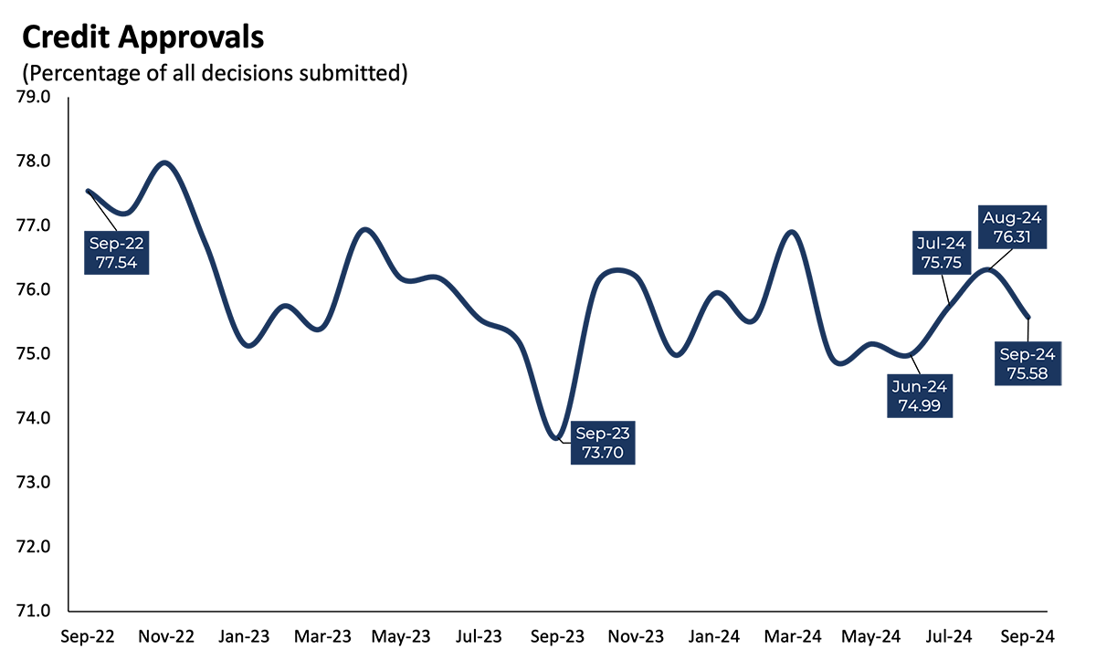 Credit approvals remained steady. The percentage of credit applications approved ticked down 0.7 percentage points to 75.6%. The approval rate has been hovering around 75% for most of 2024.