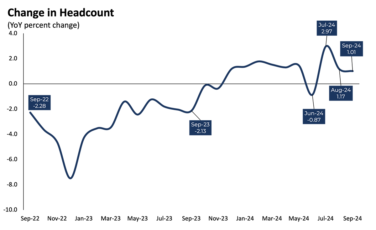 Lenders continue to add headcount. The 12-month change in employment was just over 1.0%, slightly slowing from the 1.2% pace recorded in August. Employment has been a source of strength this year, following nearly five years of persistent declines in headcount.