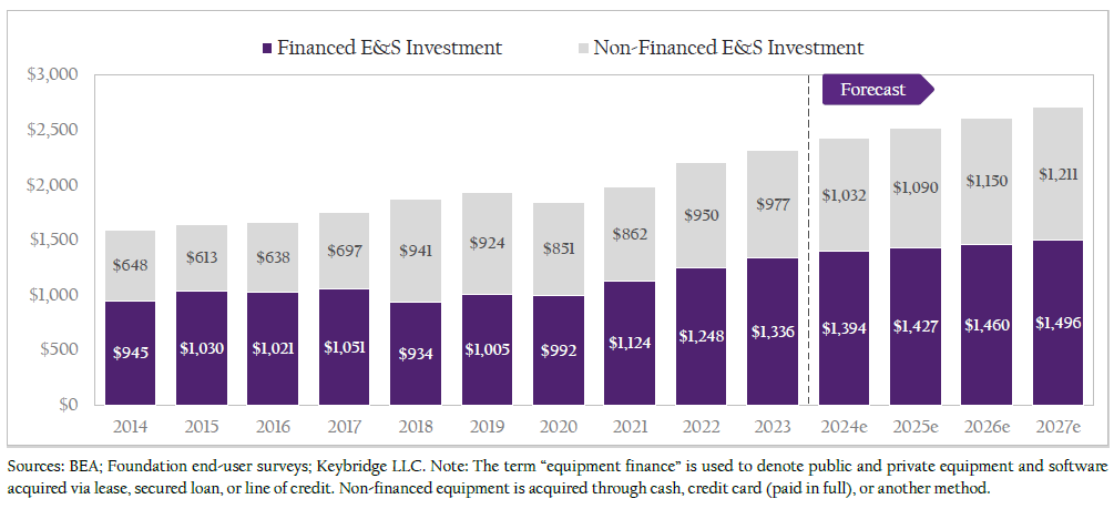 - Emerging industry growth drivers. Tracking emerging trends in the equipment finance industry, the Foundation’s 2024 survey finds that currently, 42% of E&S end-users use generative AI in their businesses, and an additional 42% indicated that they intend to do so over the next two years. Regarding EaaS, half of end-users already use a subscription-based model for equipment and an additional 23% indicated that they intend to pursue this option in 2025. Meanwhile, nearly one-third of E&S was acquired to support energy-related, climate-related, or other environmental goals and pledges in 2023. With global climate finance expected to grow to $9 trillion by 2030, this is likely to be a key area of growth for the industry in the years ahead.